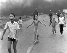 It is a picture of Vietnamese people running away from a Napalm attack. This photo was the beginning of the end for war correspondence. It brought the reality of Vietnam home. Years later the girl in the center of the photo would make an American plastic surgeon famous. As if the damage of the war was thus undone. Napalm was manufactured by Dow Chemical, who also, in cooperation with Monsanto, manufactured Agent Orange. Agent Orange was used against the Vietnamese as a defoliant, but is most remembered for poisoning the American soldiers who handled it. Look at her.