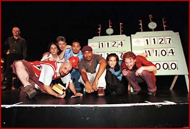 CHAMPIONS -- the SVPS and San Francisco Teams pose before the scoreboard.