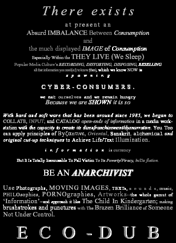 ![]() --Dub Statement captured by Mantissa at Feedhorn N.96; 1995 |