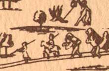 The storytellers say that Cuahuitlicac told Huitzilopochtli of the approach of his siblings, as they passed from place to place on their way to Coatepec, where Coatlicue waited to give birth. The Huitznahua passed Tzompantitlan, Place of the Skull, and Coaxalpan, Apetlac, and arrived at the slope of Coatepec. As they came up Coatepec, Cuauhtlicac saw them, and said: "At last they arrive here. Coyolxauhqui comes leading them." |