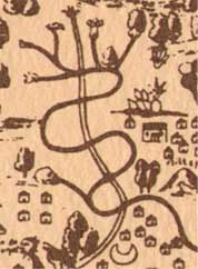 Teteo Innan, Mother of the Gods, wore cotton flowers, and the shell-covered citlalcue, the star-skirt. "Eagle feathers were strewn over her blouse--it was strewn with eagle feathers; it had white eagle feathers, pointed eagle feathers." Her shield was described as golden and perforated in the center, like the spindle whorls used by mortal women, which were decorated with devices from shields. In her other hand she held a broom.