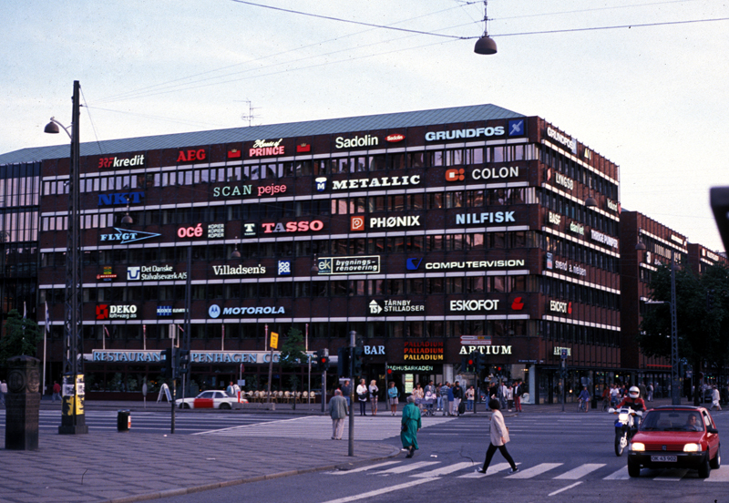 A building on the city square in Copenhagen, decorated with the logos of multi-national corporations