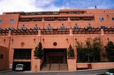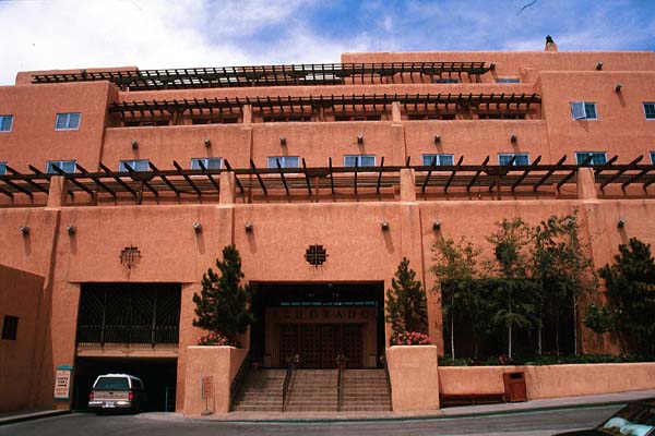 The El Dorado hotel in Santa Fe, New Mexico, co-opting the style and spectacle of Pueblo buildings