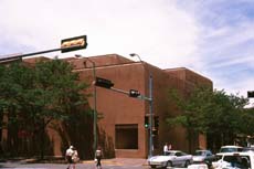 Contemporary bank building in Santa Fe, built in the required adobe style