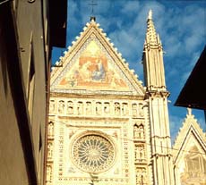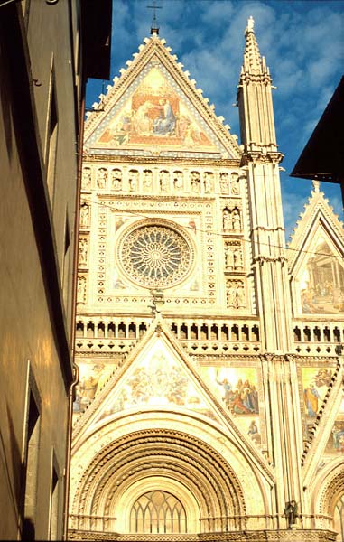 At the Duomo in Orvieto on a fall afternoon, the low sun touches the gold mosaics and pours out a liquid radiance carrying the brilliant red and blue figures, so bright it presses us back as it draws us closer. Later, at night, the piazza is empty and waiting. It will wait long for a truly religious crowd again. The next morning, in shadow, the facade is subdued but still assertive. Policemen and shopkeepers prepare for the tourists, and don't stop to read the facade. Then come the tour groups. The facade mosaics and sculptures offer texts to be read in a size and variety that rebuffs simplicity.