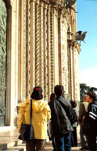 A Japanese tour guide said to her group, in response to a question about the Jesse Tree image by the door of the Duomo at Orvieto, "I have no idea what these symbols mean."Two American groups complained to one another about the prices in the restaurant across the piazza. They were right to complain, but their children were happy with the video games installed in the restaurant. A Martian tour group arrived at night to see the moonlight reflecting off the golden mosaics. They carried little machines that kept whispering in their ears, telling them what they saw. The guide machines also told them that they were enjoying a unique experience. Since Martians are very small, the cobblestones caused them problems, but their size also allowed them to climb all over the mosaics. They examined the little golden puzzle pieces with great care. I don't think they ever saw the big picture.