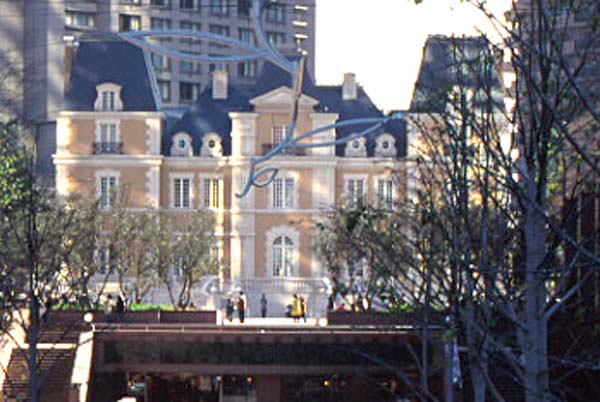 I've used my slides of the Chateau at Ebisu Garden Place to stimulate class discussion about context. The Chateau bothers students. Yet they don't balk at seeing modern International Style office buildings in Tokyo, perhaps because that style is not felt to be the property of any one group. They don't even mind the pomo classicism on some buildings at Ebisu, perhaps because it's so smoothed out that they don't read it as Western. The Chateau is not as large or irregular as a real chateau, but it looks like it might be on a postcard from France. It's as much a symbol as the folly they made out of the old brewery building, but it feels more real, and more out of place. My students laugh nervously and protest that the Chateau doesn't belong there. I remember my excitement when I first saw the Chateau -- I thought "this will be a sensational example for class discussion" but then I thought, "well, why not build a chateau there?" Given the ways architectural signifiers can be abstracted and moved around, what's so exceptional about Tokyo developers wanting to use a chateau-form to suggest luxury and quality? There's nothing theoretically surprising in the Chateau being there, and it doesn't bother the Japanese. Maybe the question should be reversed: Why, given the mobility of architectural forms, is there only one chateau in a prominent place in Tokyo? Is there an inertia even in the flighty mobility of signifiers? Is there tradition at work in supposedly anti-traditional cut-and-paste?