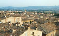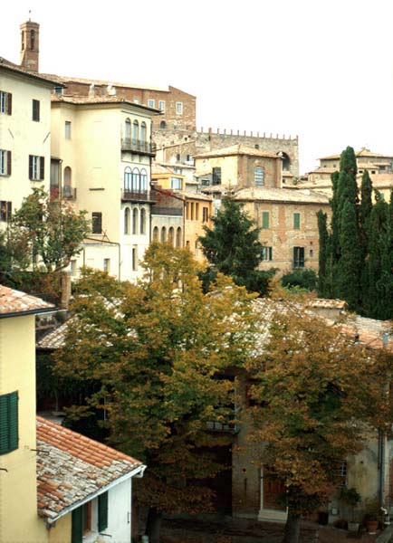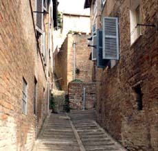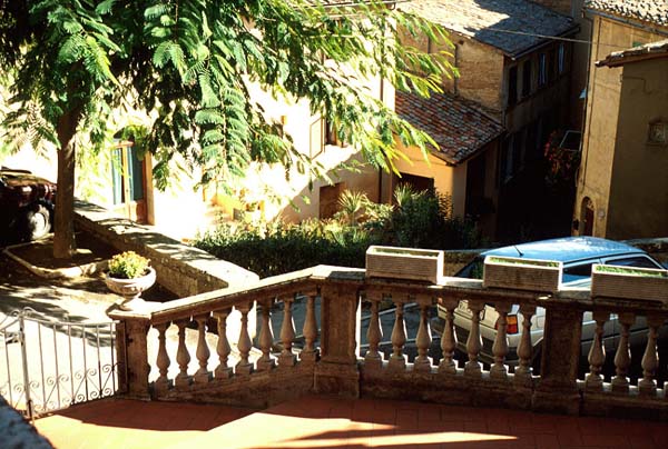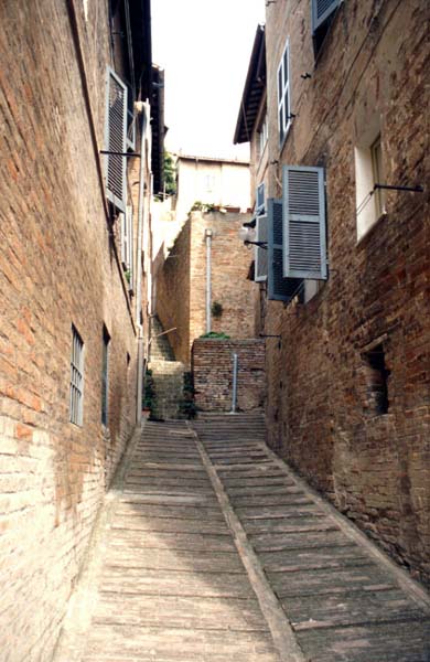 The hill towns are very physical. This is not just visual, it is the way sounds echo, the smells, the color and texture of the stones in the walls, the twists and bumps underfoot, the changes in the level of the street with thoughtful little ramps and curving steps, the constrictions and flow and distension of space in the streets and piazzas. The constant variation underfoot locates you. Everywhere there are edges and shadows. There is no overall geometric plan, but there is care for the changing views. Spatially, the towns vary. There is a common general grammar polarized between the city gates and the main piazza that holds church and government buildings. The layout in-between these poles does not follow a single pattern. The combination of distinct poles and irregular middle zones lets these small towns accept the tourist flows without being so disrupted as more hierarchical spaces might be. Though the materials and building types remain similar, spatial effects vary. Siena with its long narrow high-walled streets and few piazzas shapes a different space and movement than Orvieto with its shorter street segments and many small openings in the fabric of the city. Montepulciano, the highest of the larger hill towns, makes the hill itself very present in its steep streets and its glimpses down onto valley fields through little arched alleyways, then through sudden streetside vistas onto wide panoramas. Orvieto cannot be seen from within itself, but in Montepulciano some points on the inside of the curve of the city offer views of the outside of other parts of the city. At Montalcino a grid drapes over the hill top, ignoring the contours of the land, with height changes everywhere along the streets. San Quirico d'Orcia blends into its contemporary surrounding smoothly rather than being elevated above it. Gubbio climbs up its hillside, with the mountain above and the valley beyond changing as you ascend. Castello di Murlo sits in tiny splendid isolation, twenty houses and one or two public buildings around three little piazzas with no streets at all. Urbino claims several hills, offering views of itself from inside, self-referential in its independence. Montefollonico, empty at siesta after the rain, falls away from its medieval core in narrow streets that abruptly cast you downhill. Radda in Chianti offers an inward piazza opening to a park and a wide curve of street overlooking the valley. Castellana mounts to a summit piazza and tower. Pienza along its narrow ridge has its historic street paralleled by a newer road. One main street, parallel streets, a grid, a labyrinth, flow and piazzas, high and low, narrow and wide, the highway bypassing or going through, views within or out, uniform heights or abrupt changes: these make for different spatial effects within the overall type. The stone walls are punctuated by intense little gardens, not French or English, with everyday items, a little disorderly. There is street texture on many scales. The general rhythm of streets and piazzas makes the town a mosaic like the street paving, irregular stones and facades and buildings set together to make a whole that is more than any one of them, viewable at different distances. The grammars of action make an irregular pattern too, overlapping and reinforcing each other. At night the towns close upon themselves, shuttered and empty, with spots of light and noise as occasional hints of liveliness inside the stone walls. Recall Asciano at sunset, as we met at the fountain among teenagers at their rituals.