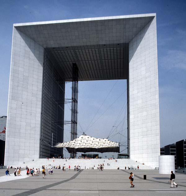 La Défense's Grande Arche is a monument for our time, geometrical and blank. Its grammar enjoins monumentality but not any specific remembrance. It is impressive, dominating, even triumphal, but not in any definite sense. Like the Louvre pyramid it combines pure geometry with generic historical reference. Pure geometry is safer; more specific monuments are difficult in a multicultural, often ironic setting. Its great sweeps of steps decorate the Grande Arche's geometry with today's life, people enjoying the view and the sun.