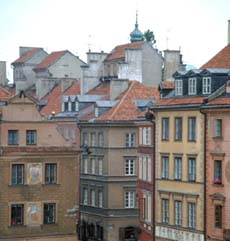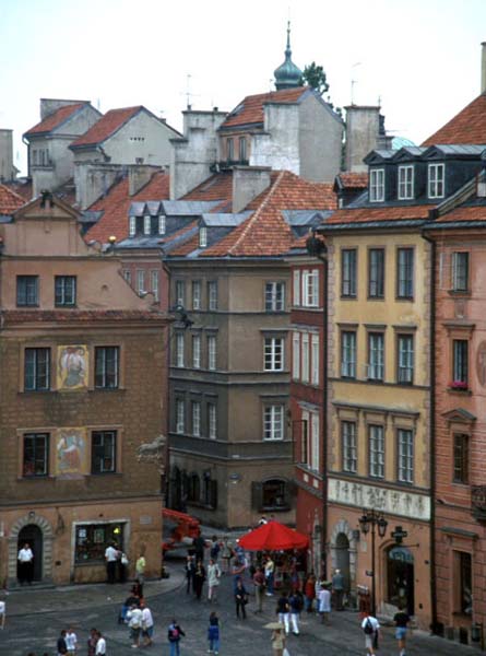 The Old Town in Warsaw was rebuilt from ruins, so it is at most around fifty years old. I saw 1953 on one weathervane, and some work wasn't finished until the 1970s. When the Poles rebuilt the old buildings they didn't make them precisely as they were in 1939. They left off additions and changes that had been made over the previous few centuries. The result is more authentic in one sense and less so in another. The houses around the central square in Warsaw's Old Town look separate, but on one whole side of the square the rooms behind the facades of the row of houses have all been connected and made into the Museum of the City of Warsaw. The whole Old Town looks about the same age, because it is about the same age, yet it has styles from various medieval and early modern periods. That's one reason it feels a bit like a theme park. How do we distinguish adaptive reuse from theming? The Old Town facades are all clean and the street paving neat and the colors brighter than in the other towns we saw. Now all the Old Towns are being repaired after fifty years of neglect. Is dirt and chipped stucco and uneven street paving part of their ambience?