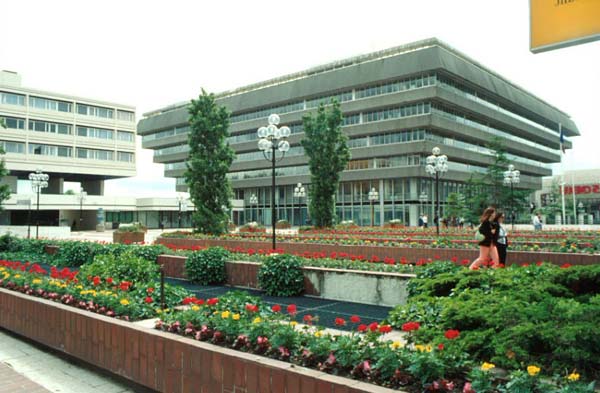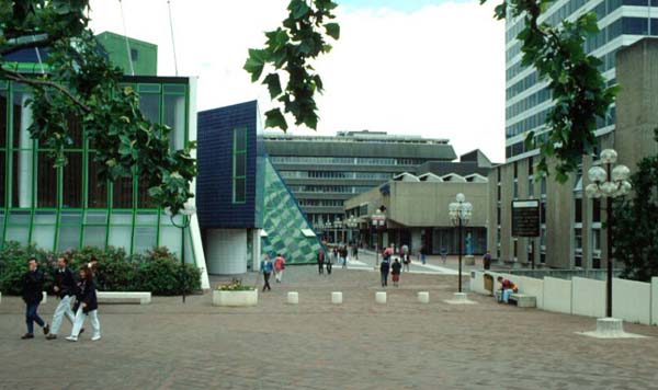 I went to visit another new town that a French friend said was considered more successful than Saint-Quentin, Cergy le Préfecture. Seen from a distance the residential districts seemed pleasant enough, with a varied topograpy and more detached single houses. The town center was the featured attraction. There an area perhaps five city blocks square had been raised up on a podium, with traffic passing underneath. The buildings thrust three to six stories up through the podium. They were rooted below, so that the surface I walked on was a floating membrane, like the surface of the sea penetrated by bold icebergs. The buildings' sharp geometries clashed in shape and color and surface texture. In some ways the area resembled a mall or shopping development, but the buildings were too large for that, their shapes too various, and they contained too many different functions (a music school, a public school, a library, the civic offices, and so on, as well as stores and restaurants). This was a town, not a unified mall environment. Yet the effect was very different from most pedestrianized areas, because you were constantly reminded that you were above, that there was a border where you stop and look down, a place of descent and abrupt change. I felt ungrounded. It was not a bad feeling.