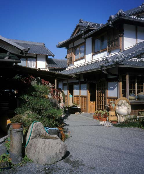 Potter's house in Shigaraki, Japan. Note the tanuki statue at the corner of the house