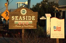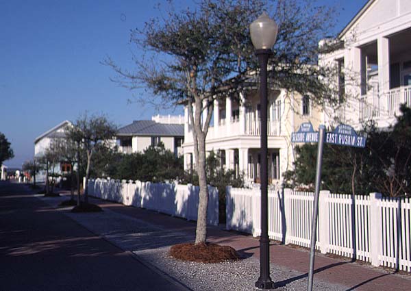 First impressions of the legendary Seaside: compared to Kentlands and Celebration the houses are more fanciful, with wonderful colors, more follies and, of course, their towers. The houses are more vertical and the towers punctuate the rooflines, so the street widths feel quite different. Many brick roads, fine subordinate groupings around spaces and parks, the marvelous secondary circulation of paths. Cars are less well accommodated than in later developments. The place feels light and exciting, opening and relaxing. The beach is lovely as always along the Gulf coast, but there are other developments nearby that debase the Seaside idiom.