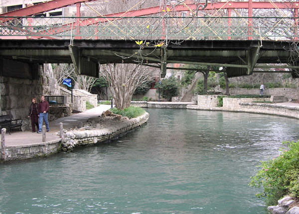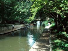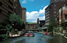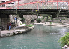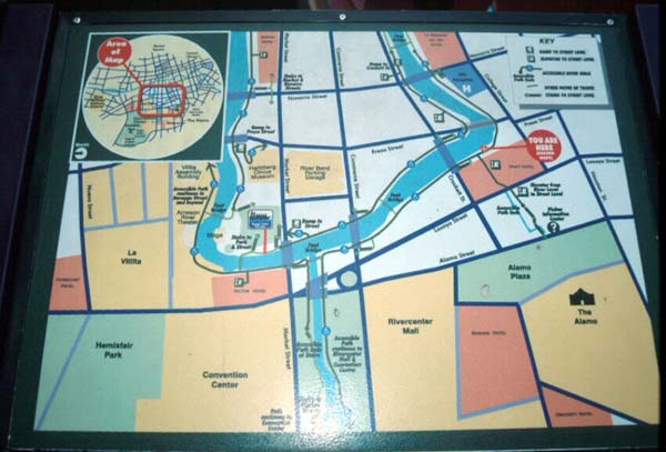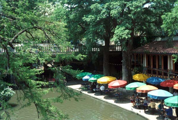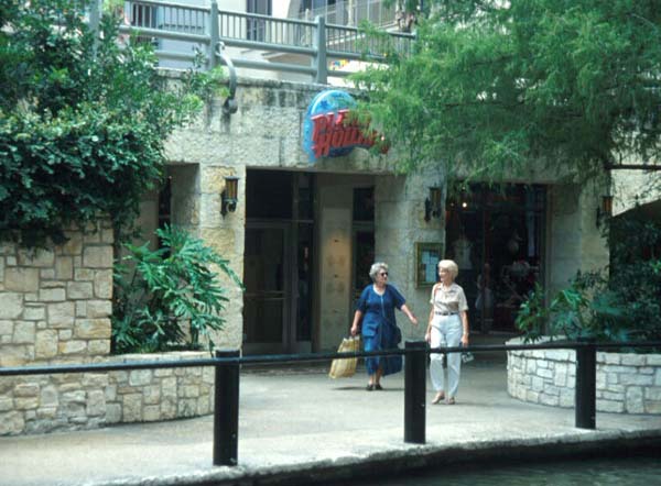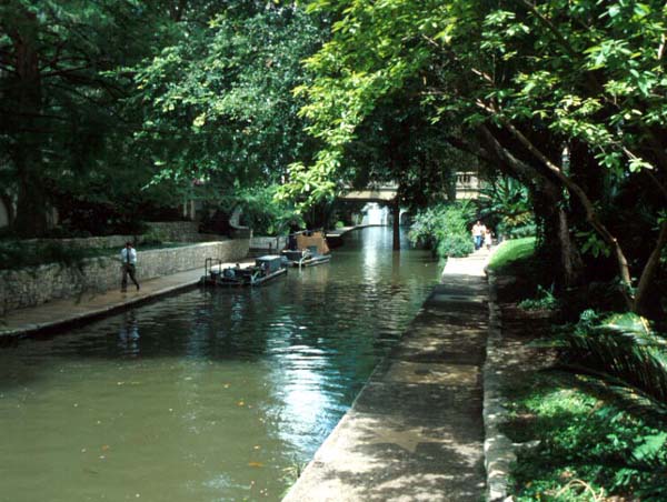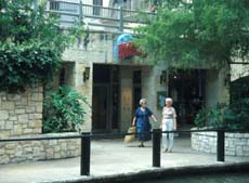 The Riverwalk was built as a public project in San Antonio during the 1930's, based on a small walk dating from the early years of the century. It's expanded more recently -- you could stroll the 1930's D-shaped portion in less than a not too hurried hour. A spur was added to the site of the 1968 Hemisfair, and recently a northern extension leads up the river to the public library. The Walk encloses its own world. It is set below the grade of the city streets; it focuses you on the river, the passing boats with their cargo or tourists, the parallel walk on the other side, the shops and entrances, the trees. Street bridges arching above signal the various city blocks, so you are both detached and connected. I first visited it in 1966, when it had been long established, and since then it has changed at an accelerating rate. Originally the Riverwalk was a promenade where already established hotels, restaurants, offices and apartment houses opened doors onto the river. It was a city street turned water boulevard, with little sidewalk cafes and terraces. Some parts were plainer, which is still true on the southern part of the "D." There you find stretches without tourist attractions, where people are going about the activities of daily life. That section demands familiarity with what is inside the pleasant but unlabeled openings to the river. Even on the more touristy northern and central stretches there are still some older terraces with restaurant tables where the locals gather. The tourists are enticed and accommodated. There are now souvenir shops, kiosks, faster foods. Portions of the walk have been malled. You are offered brands rather than singularities. Next to the terrace for an old institution, La Mansion Hotel, you find noisy trendy restaurants, then a tee-shirt store. The atmosphere in those sections is different, out to get you with a slightly frenetic hilarity. At the turn of the D there is a mini-mall. Imagine the conceit of enticing tourists inside, away from what they came to experience, into a space that is indistinguishable from their malls back home. The mini-mall is in the basement of a new hotel that has its own atrium, so it creates a space that ignores the Riverwalk but depends on it. There were not so many people inside. There is larger mall at the end of the Hemisfair branch of the walk, but at least there several floors of stores are in a U-shape that embraces and views the pool where boats land and depart. There is older traditional market just off the Riverwalk. It is called La Villita and it antedates not only the Riverwalk but the entire American city. That market is up on the street level and an attraction in its own right. It does not need the Riverwalk, but it has an entrance there. Opposite La Mansion's dignified restaurant terrace and a little down to the left was the Hard Rock Cafe San Antonio, and directly opposite La Mansion they were building the San Antonio edition of Planet Hollywood, a themed eatery/bar. To be themed is the next step beyond being malled. The chains offer you a unified experience. This is the Planet Hollywood; you are entering the same zone from its door on the Riverwalk as you did from its door in London. Not just an anonymous selling place but a brand name Experience. Dionysus tamed. Along the Riverwalk, the outdoor Riverside Theater's little amphitheater faces a stage on the other side of the river canal. It looks a little shabby compared to the glitzy attractions, but it offers free public space where you can sit on grassy terraces and watch the spectacle walking or boating by. People chat or eat lunch. (There was a boat parked at the theater, labeled "Park Ranger." It made me look for the bears. Were they all around?) Sitting on the grass you can watch the tour barges go by with their regimented rows on hard benches taking photos and trying to hear the guide's enthusiastic spiel above the sound of the motors. They go around and around, with a brief shortcut on the real river, which is now colonized by a northward extension of the Riverwalk to a new hotel.
