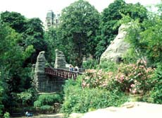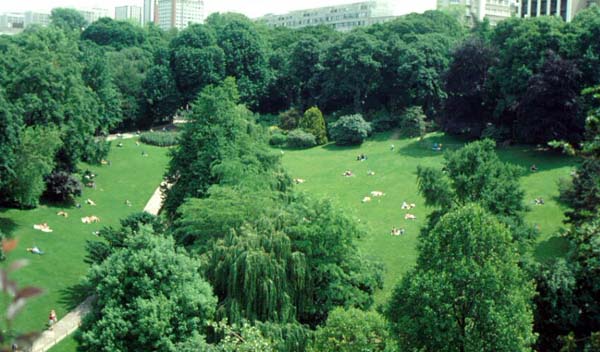 The whole of Parc Buttes Chaumont is a folly in the old sense; it fantasizes another world. It was built from an abandoned quarry and has unusually dramatic changes of level for a Paris park. People were content to come and relax on a sunny day. There was busy action at Parc La Villette, because of the athletic playing fields and open spaces there. But Parc Buttes Chaumont was more densely used; people played with the park's special features more than they did at La Villette. They staged a wedding, sent their children exploring the grottos and towers, or stood gazing down on the sunbathers below. The usual city park grammar took in and heightened the fantasy in a very relaxed way.