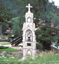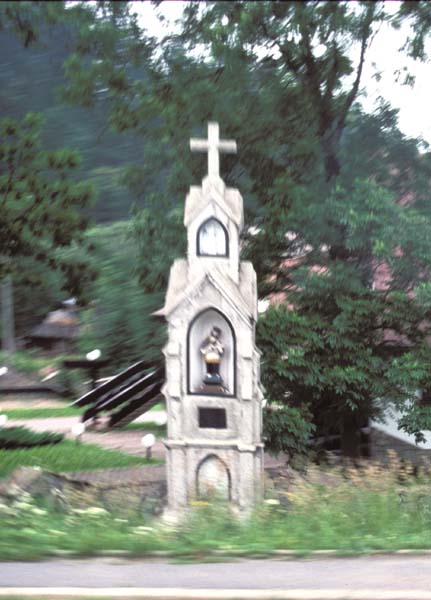 Fixed horizons become fluid: a Polish roadside shrine viewed from a moving bus