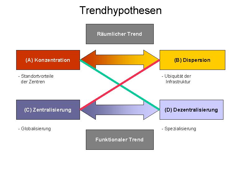 Hypothetical trends: Spatial trends: concentration (locational advantages of the center) vs. dispersion (the ubiquity of infrastructure); Functional trends: centralization (globalization) vs. decentralization (specialization) -- Image used with permission from Prof. Manfed Sinz's lecture on contemporary space issues