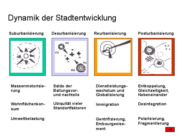 The dynamics of the evolution of cities: Suburbanization (mass automobile use, consumption of dwelling space, environmental stress), (Deurbanization (balance of advantages and disadvantages of agglomeration), Reurbanization (growth of services, immigation, gentrification), Posturbanization (disconnection, simultaneity, adjacency, disintegration, polarization, fragmentation) -- Image used with permission from Prof. Manfed Sinz's lecture on contemporary space issues