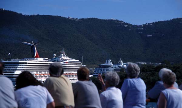 Tourists on one cruise ship staring at other cruise ships