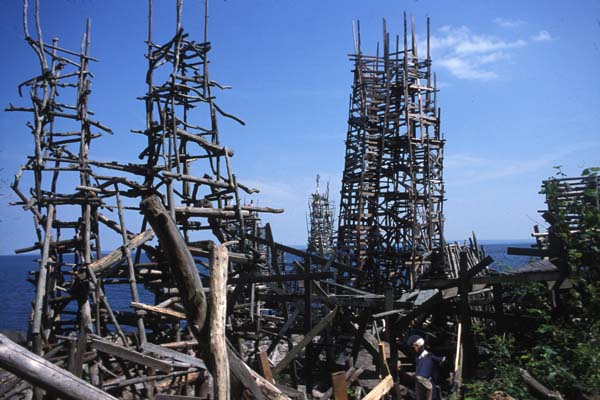 Places constructed of bits and pieces of other places (wood sculpture Nimis by Lars Vilks, Sweden)