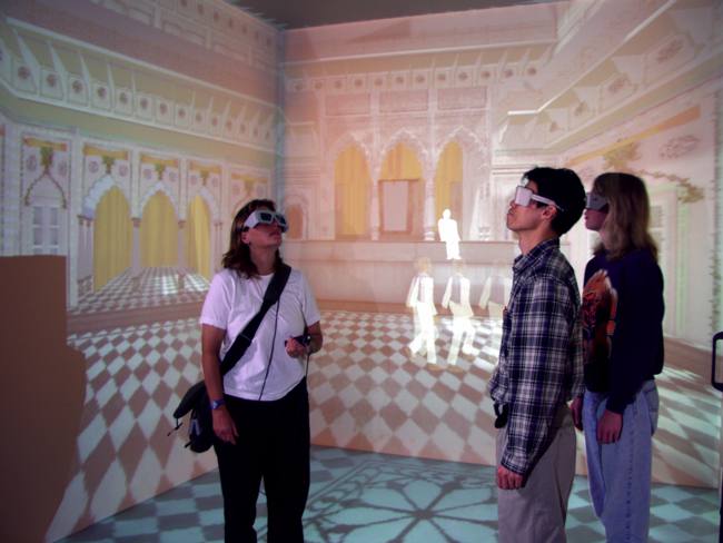 Exploring a temple in a virtual reality cave at Iowa State University -- image reproduced courtesy of Whitney Sanford