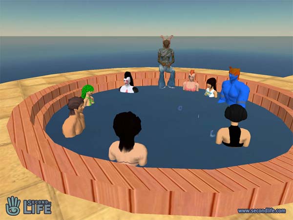 Gathering around the wishing well, in Second Life. (Image copyright 2003, Linden Research, Inc. All Rights Reserved.)