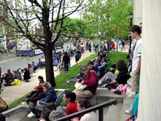 Cityfolk watching a parade, not conversing with one another