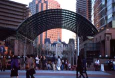 The Chateau's vulnerability is accentuated by its position as the focus of the whole development, framed at the end of the vaulted plaza, looked down on by all the tall buildings. As is common in Japan, this focal building is inaccessible except to a privileged group. You cannot get inside the Chateau unless you go to its expensive restaurant or join its exclusive club; these are accessible from the basement mall where the Chateau maintains an unobtrusive elevator.