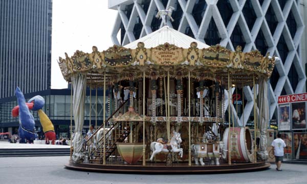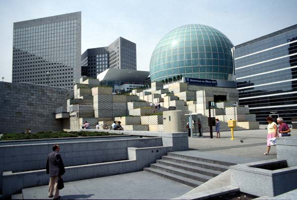 It could be a paradigm for a virtual mall. Most Parisians exclaim how terrible la Défense is in comparison to the historical texture of central Paris, but I did not find it so bad. My diary entry begins "shapes!" Parisian street buildings do not have shapes; they have facades. Only the freestanding monuments such as Notre Dame and the Opéra have shapes. You come to La Défense and find yourself in a corridor of space where huge free-standing shapes and colors border a linear space that feels very different from the uniformly walled Parisian streets. At la Défense the individual buildings stand out within the discipline of the immense corridor. To the west side of the Grande Arche, the corridor gives way and the buildings just lie randomly about. Toward the east, though, the corridor is open down the Champs Elys es toward the horizon, yet focussed on the far distant arches at L'Étoile and the Tuilleries, so it is both the same and different from Paris streets with focal monuments, such as the avenue from the Opéra to the Place Vendome. What is most un-Parisian at la Défense is the way the buildings compete rather than cooperate; my guide book says that their odder shapes resulted from workers' demands to have windows near their work desks. It is strange to think of these vertical buildings reaching for the sun horizontally. The naked geometry of the buildings lacks detail and human scale, but on the flat plane (la Dalle) there stand some curves at about human scale, overlooked by the big geometries. Some of these curves -- on the carrousel, on the sculpture -- have the appearance of having been dropped onto the geometrical plane without quite touching it. There were no birds on the plaza. The great corridor means that the large mall buildings themselves become secondary spaces. There is energy and an expanse in which to exercise it; people walked about with a freedom very different from their canalized motions on the rue de Rivoli. There is less weight of history here. There is more distance from the money-grabbers and the attractions, but there is also less density of encounter; la Défense is a lonely place even when crowded, and it is crushing when deserted. The whole ensemble has a non-Corbusian late-modernist quality; there is no postmodernist historicism or deconstructive transgression. None of the buildings are particularly light-hearted; they take themselves quite seriously -- some are downright sinister -- yet the overall effect is playful, because the uniformity of color on each building gives the impression that you are standing amid a set of gigantic curiously shaped toy blocks.