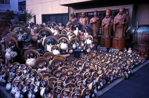 I had been told that this village not too far from Kyoto had been a wonderful place to visit thirty years before. Now, I feared it would be a strip mall of pottery shops. In many ways it was, with the village's trademark ceramic animal garden statues of tanuki everywhere. But not entirely. Like many Japanese rural towns the overall effect was somewhat shabby. There is a mix of concrete and wood; the jumble lacks the aesthetics of a farm or temple compound. We were recommended to a "true traditional potter of the area" whose work was indeed exciting, and who had only one tanuki on display, an older one more subtle than the usual mass-produced figures. But it was the family members working in the store that really impressed us, the ones who don't make the pottery but sell, and enjoy meeting people. When we bought a vase, they said, "This is the countryside [oinaka]; we don't do credit cards." They were good people, easy going, but still they were dependent on the high velocity economy elsewhere. The less artistic shops down the street pointed up the economics and politics of the situation. The town was not as simple as its self-proclaimed image.