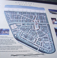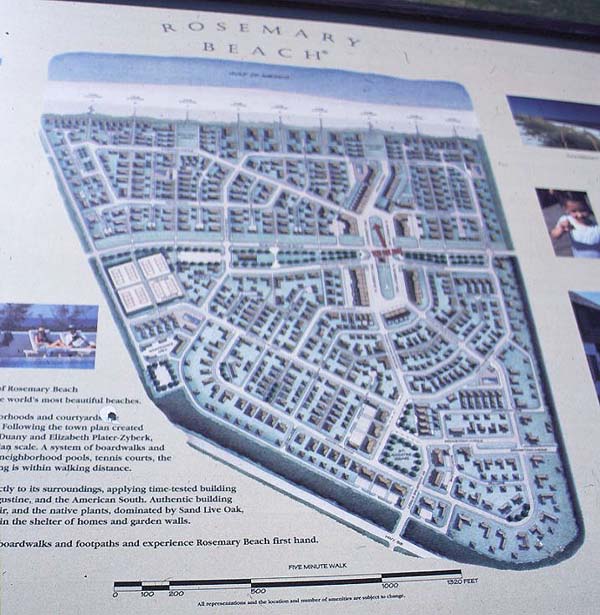 Eight miles east along the coast, Rosemary Beach advertises itself as a new town ("On a perfect beach, a new town is taking shape"). It was designed by Duany-Plater-Zyberk, who planned Seaside years earlier. The land office at Rosemary Beach does not expect many permanent inhabitants; as in Seaside most houses will be used for vacation homes, and for short term rentals. The general layout resembles Seaside, but here the highway is further back from the water. There will be a larger town center, and Seaside's network of fenced paths is replaced by a few boardwalks with pocket parks. The spatial plans and modulations seem as well done as at Seaside, but the effect will be quite different; the whole feels denser and heavier.