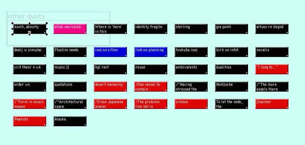 The Tinderbox map of an early stage of this hypertext, which was merely a collection of scattered notes and quotations
