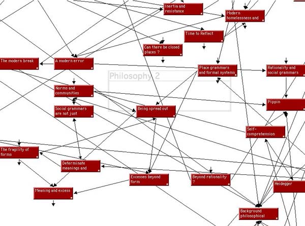 Since I have written elsewhere about the modes of presenting argument in hypertext, writing this hypertext put me in an awkward position. Using portions of a book text, I felt pressure to make the argument in a fairly conventional structure, what I had called elsewhere a pyramid outline, where each text node contained standard argumentative paragraphs. The outlines presented in this text lead to about a third of the total text; from there on there are various kinds of links. Many of the outlines lead to "tangles" of expository text nodes. Most of the links are straightforward, but there are also associational jumps, especially between exposition of ideas and narrative scenes. A hypertext can contain different forms at the same time, since the forms come from link patterns and different sets of links can coexist. Hypertext does not have a single-ply genre essence that must be obeyed.