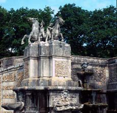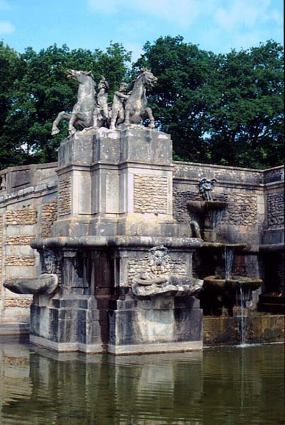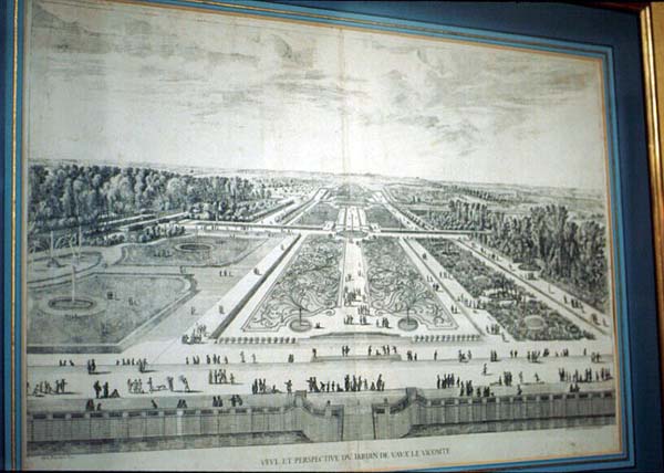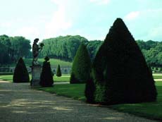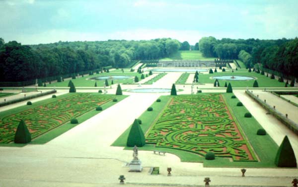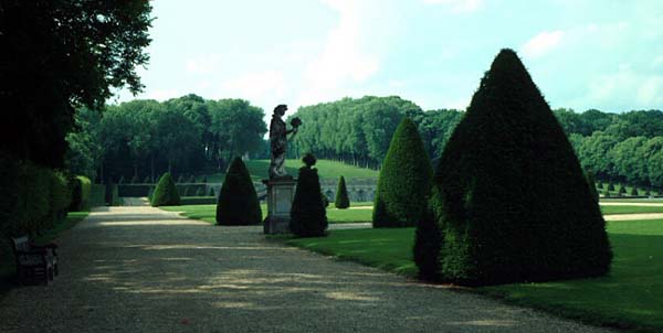 A rhythm of simplification and complexification, varying dimensions, a watery sine rhythm, and spaces within spaces always on axes or neatly included, always aligned: what a claiming of space! At the focal points, you rest with quadrated infinity. Extent and control: things are revealed in sudden reorientations, as when the canal blocks your path but suddenly offers another axis for motion. There is also an armature of paths in the woods that would have been much more part of your experience of the park in the days of carriages and rides. These more informal wood and field paths make a welcome change yet remain part of the composition. There is a difference in feel at each of the crossbars on the main axis. Varying dimensions and closure points, rest and harmony, power and flow. The round end of the cross canal is a surprise and creates its own separate centered space. There are wonderful details such as the lowered rim on part of the circular basin, or the way that as you come down the slope from the Hercules statue the whole construction tilts and the now small square of water seizes the heavens. This orderly place makes you see a natural law of spaces and shapes, though that law does not have a simple application. The arrangement of pyramidal trees on grid: In this type of garden single plants do not appear as particular individuals, but only as representatives of types. If the water in the canal were visibly flowing, the whole effect would be different, even if you could not perceive the movement from a distance.Of course my experience of Vaux le Vicomte is much more romantic than theirs would have been, despite the austere geometry. The nineteenth century has intervened, with a new conception of nature, and there is the play of contrasts with current cities and with modernist geometries. Over time, too, the trees have grown much taller than the trees shown in the engravings of the original park. Most importantly, my experience is more solitary than it could ever have been for them; I arrived on a day when there were perhaps ten visitors in the whole huge tract; nor were there visible caretakers. In the beginning they lived the glorious geometries of the park as an armature for busy activities, whereas I experience a solitary reverie.So the grammar and norms of the place have changed with changing contrasts and changing conditions of inhabitation. Then it was a busy estate showing its owner's power and its designer's genius. That still happens, but not in the same context. There is now also the contrast with Versailles. You could say that this place is now a museum, but that doesn't feel quite quite right. In some ways it is more like a wilderness preserve; partly on display, partly just being itself. It is significant that it is run by a private group. Still the rules of engagement with the place are more like being in a museum than in a friend's garden; you act more reverently than the original inhabitants would have done, and you leave as few tracks as possible.