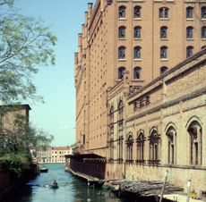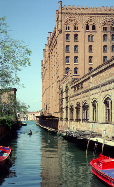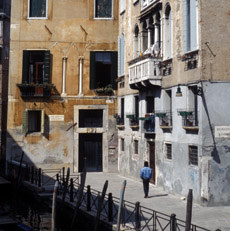 The narrative quality of Venice almost overpowers you. It seems to have been built because of all the stories and films about it. It provides its own commentary. Flowing and still water. You see a Roman cardo and decumanus: the grand canal, extended in the line between the Guidecca and San Giorgio, crossed by the main S-curve of the fondamenta. Parallel curves for the old axes; it seems appropriate, yet it twines through a maze. The spatial modulation of walking in Venice: narrow, high, blind ends, wide two sided, one sided open, varying warmth and air, water, stone, occasional greenery, water still surprising you. Huge campi I missed the other day, probably passing them very close, but you don't know what is behind the line of buildings. The rhythm is in your choice as you walk; it punctuates moods, creates a story with suspense, or a random labyrinthine quality, with unexpected convergences influences crossing with your thoughts and talking and vision. Parts are like Treviso or other cities, but there are no cars and little freight on the walkways. A restricted language of formal variations on small number of types. A grammar of use that takes up the uniqueness of the setting. The qualities simplify at the edges, but in different ways in different areas: high at ghetto, straight beyond, single buildings, compounds, green, and so on. The center has these mixed, or in potency. So has Venice become an object rather than a city? No, but it is a city with a much more self-conscious self-presentation. A themed place, if you will, whose theme is itself and its own history.