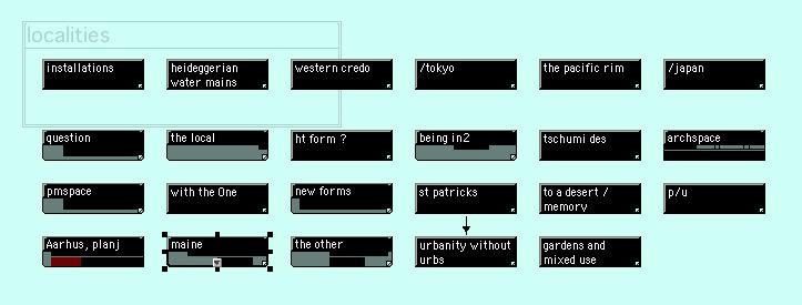 A still later version of the project, after some topics had begun to collect quotations and examples under them. Boxes with two-tone colors have become containers for other nodes.