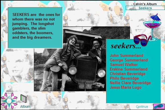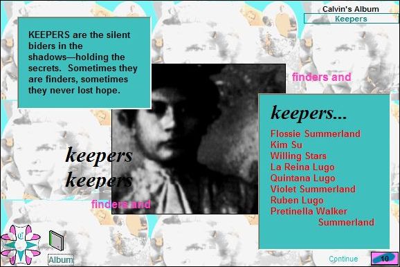 In the Archives, Augusta organizes the photos and profiles of the characters that Calvin introduces in the course of the journeys. |