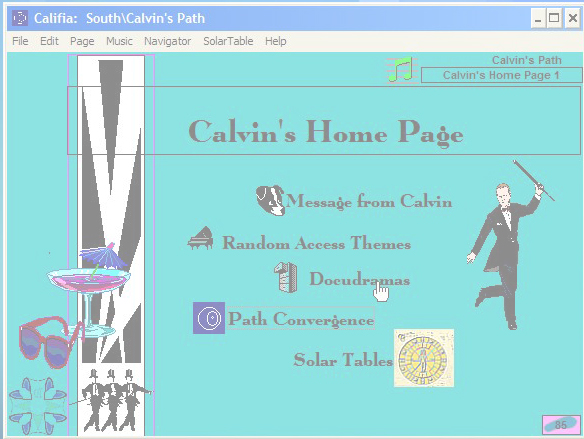 Throughout the Califia adventures, Calvin will provide Albums, Docudramas, Clues, Random Access to Themes, and a running commentary from his Back Yard. See Calvin in The Journey South. |