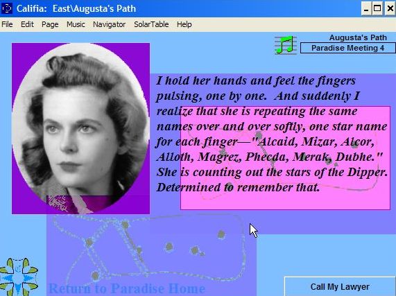 In the East, Augusta tells of the events as the trio visit The Dipper Mine, Augusta continues to visit her Mother in Paradise Home, and finds out more about The Man from Windpower. |