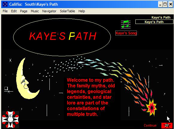 Each of the Narrators, Augusta, Kaye, and Calvin have their own paths through the various Journeys. In The Journey South, Comets in the Yard, Kaye introduces herself, tells her Backstory, and begins the Legends, Family Myths, Geological Certainties, and Star Lore that provide a different dimension to the Califia story . |