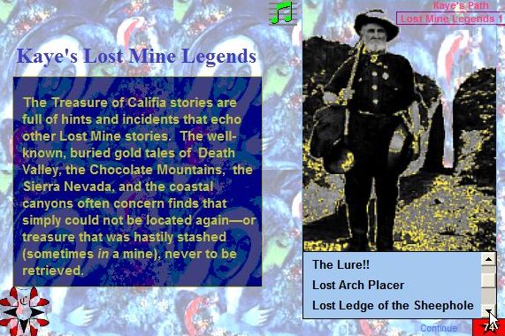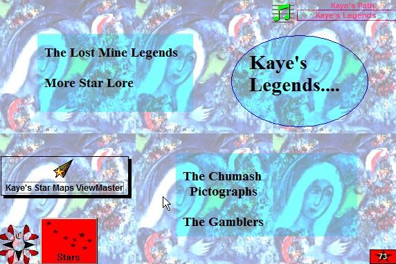 In the North, Kaye's path continues with Geological Certainties, Legends, Family Myths, and Star Lore. More about Kaye in the South at her introductory site. |