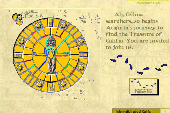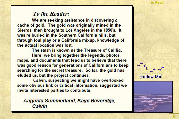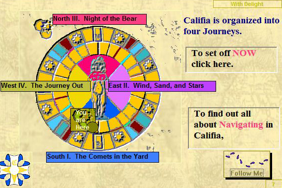 The Roadhead is the place where the Reader can take compass bearings, get oriented to the landscape, learn how to navigate the Califia world, and find out about the creation and creators in this work. The Reader will have a choice of leaving on a Journey South, East, North, or West. On the trail in each direction, the narrators, Augusta, Kaye, and Calvin offer differing ways to explore the stories in that sector. |