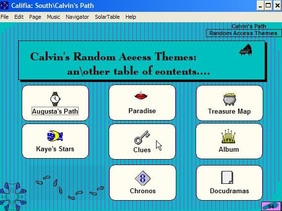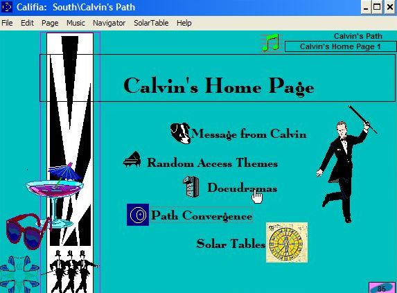 In the Journey South, Calvin begins his Album, provides the first Docudramas, and suggests some Clues that might be important in the search. More about Calvin at his introductory site. |