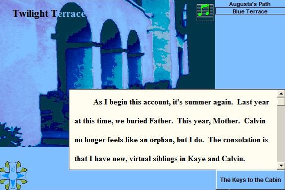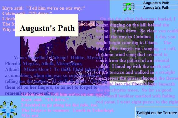 In the Journey West many things are resolved - but not all! Augusta, Calvin, and Kaye discover Ernie's Skull, have a formal confrontation with The Man from Windpower, find the rest of the Blue Blanket at Fish Camp, reclaim the Pearls at the Harbor, and take a walk with the Spirits on the Beach. More about Augusta at her introductory site. |