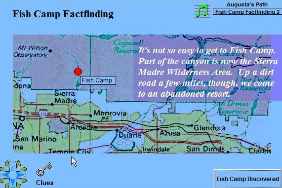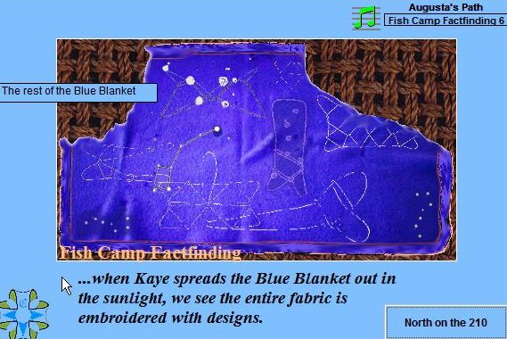 In the Journey West many things are resolved - but not all! Augusta, Calvin, and Kaye discover Ernie's Skull, have a formal confrontation with The Man from Windpower, find the rest of the Blue Blanket at Fish Camp, reclaim the Pearls at the Harbor, and take a walk with the Spirits on the Beach. More about Augusta at her introductory site. |