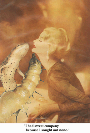 because I sought out none But took what came to me All by the magic drawn. I had sweet company I had no dark friends but one." This poem by A.E. Housman forms the title of Adam's collage, "I Had Sweet Company / because I sought out none." This collage depicts a woman who is so esthetically entranced by the physical attention she is getting from her slimy soul mates, who is so resigned to their special love, that she is far beyond male desire. Her stereotypical beauty only accentuates her alien nature. Adam has converted a model in love with jewelry into a the dreaded Lady Arabella, whose crimes against humankind are too atrocious to mention. | ||