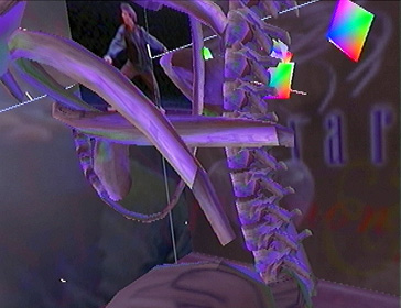 Rather than employing the "distraction" methods of meditation favored by Western medical practices as strategies for living with chronic pain, I instead draw on certain Eastern traditions, where meditative states can lead to a sense of inward expansiveness and a newly informed connectedness to our bodies. VR seemed to offer quite similar sensations, which I related to Helene Cixous' and Julia Kristeva's notions of the jouissance -- the extreme pleasure associated with open-ended textuality, the loss of bodily boundaries and a diffused or fragmentary subjectivity. (2) This piece offers users an opportunity to explore the potentially disruptive embodied subjectivity through immersive interactions with data and images of parts of my body. Derived from artistically manipulated "objective" MRI data of my body, users can explore this VR environment, which exists in a reactive state of decay and reformation. Literal pictorial and sonic representation of enormous body parts reveal paradoxically larger, surreal worlds as the user travels or "flies" within them. Poetic text wrapped around these organic structures defines them, but simultaneously confounds what constitutes inside with outside, the distance of the bodily responses to representation, indistinct separations between body and machine, (3) and the primacy of text over images. |