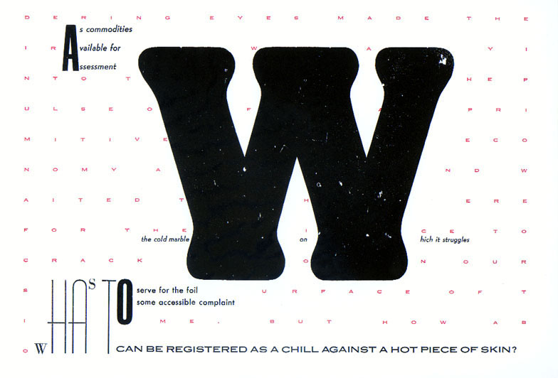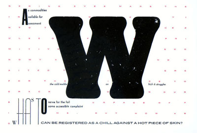 If Burger's theses of the avant-garde as questioning institution and questioning medium are to be taken for granted, then Drucker certainly fulfills expectations, and shows that the avant-garde did not die with high modernism, and can remain political. Drucker destroys any institutionalization of the routine mechanization of book production. And she tortures the very routine incarnation of the word, both paradigmatic and syntagmatic, both in appearance and in linearity. "Attention to the stuff in the medium is not the fetishization of some theory based supplement, but recognition of the fact of the matter," she writes in "Linguistic Authority and the Visual Text;" "Authority is construed to reside within power and that power in the gross concealment of its means. The laying bare of devices so dear to our forbearers was a means of deconstructing that very authority." These words are not written linearly, nor in the same font size, and show the functioning of Foucauldian micropower in language. The imaginary materiality of language is emphasized to defeat logocentrism and demystify ideology. The text opposes itself: art as anti-art. It is only natural that the twentieth century should turn to the material inscriber itself as part of its avant-garde project, given the discovery of language, and consciousness of visual culture. Take The Word Made Flesh, in which each page contains a letter which later becomes manifest as an acrostic text of the larger book. That this should manifest itself in the book form in which it does in Drucker is the result of larger social and economic forces compelling the book as focus to the foreground. Drucker's work is somewhat anarchic as it is feminist, showing that the phrase postmodern avant-garde genre, an avant-garde that is political, is not oxymoronic. ![]() But Drucker, ever in step with the times, is now ready to move beyond the book, into cyber-space, and is currently working on a hypertext at www.VisCult.com. Drucker meditates considerably on the differences between the printed and the electronic text. "The [electronic] 'forms' which will emerge won't, I don't think, replace print media for a long time we're too attached to the intimacy and convenience of portable books and magazines," she suggests in an interview, focusing on the privacy of the bourgeois sphere that Benjamin dissects in his Arcades Project and on which Watt focuses in his Rise of the Novel (Indeed, this raises interesting genre questions: though read as a "poet," Drucker sees herself as a prose writer. This is not merely the issue of prose poetry, but rather one of cultural spherification versus essentialism, which is not to argue for an essentialist generic reading of Drucker, but rather for a generic reading). "I see hypermedia in terms of continuities and disruptions" she states, seeing both similarities and differences with the book, similar ways of exploiting fonts, different temporal experiences for instance. Clearly Drucker's electronic work will have continuities and disruptions with and from her earlier work: we will see the same stylization of the material, but in an entirely different setting. Ramez Qureshi resides in Scarsdale, NY with his cat. He has degrees from The University of Pennsylvania and Bath Spa University College. He has published poetry and criticism in Read Me, Jacket, Rhizome, Lynx, and Cauldron & Net. | ||