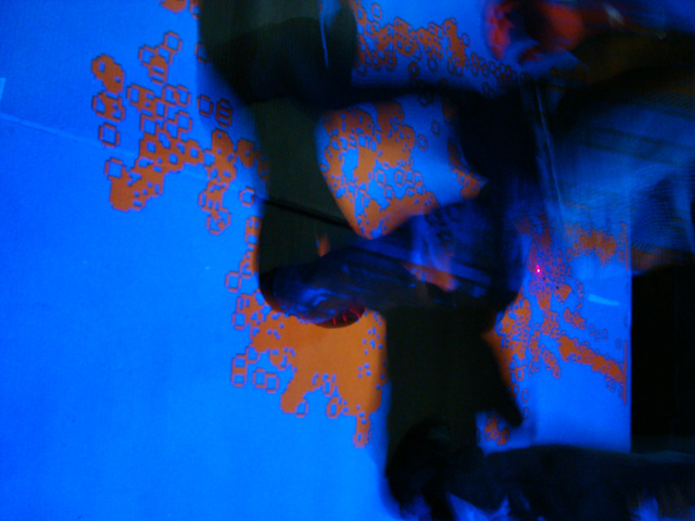 The work uses structural concepts such as: fragment of Bach, different meanings of voice, alphanumeric notations, QBasic, Asembly, textual languages, codes of light, harmonic modulations, phrases written under the spell of the web, reminiscences and obsessions that will be the symbolic fabric of this drawing: a perceptible dialogue between subject/object that is accentuated by the serial communication between machine and speaker.