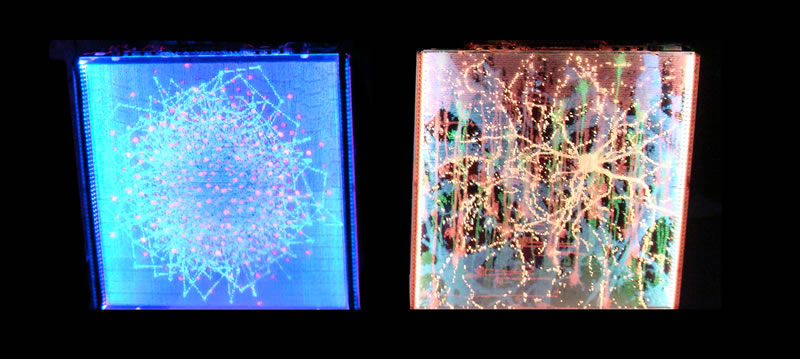 [re][des]arm[o] is a proposition that organizes itself by paraphrasing the web, creating a kind of organism that comes to life itself as it moves to different states conditioned by the presence of the viewer and the machines’ own interactions.